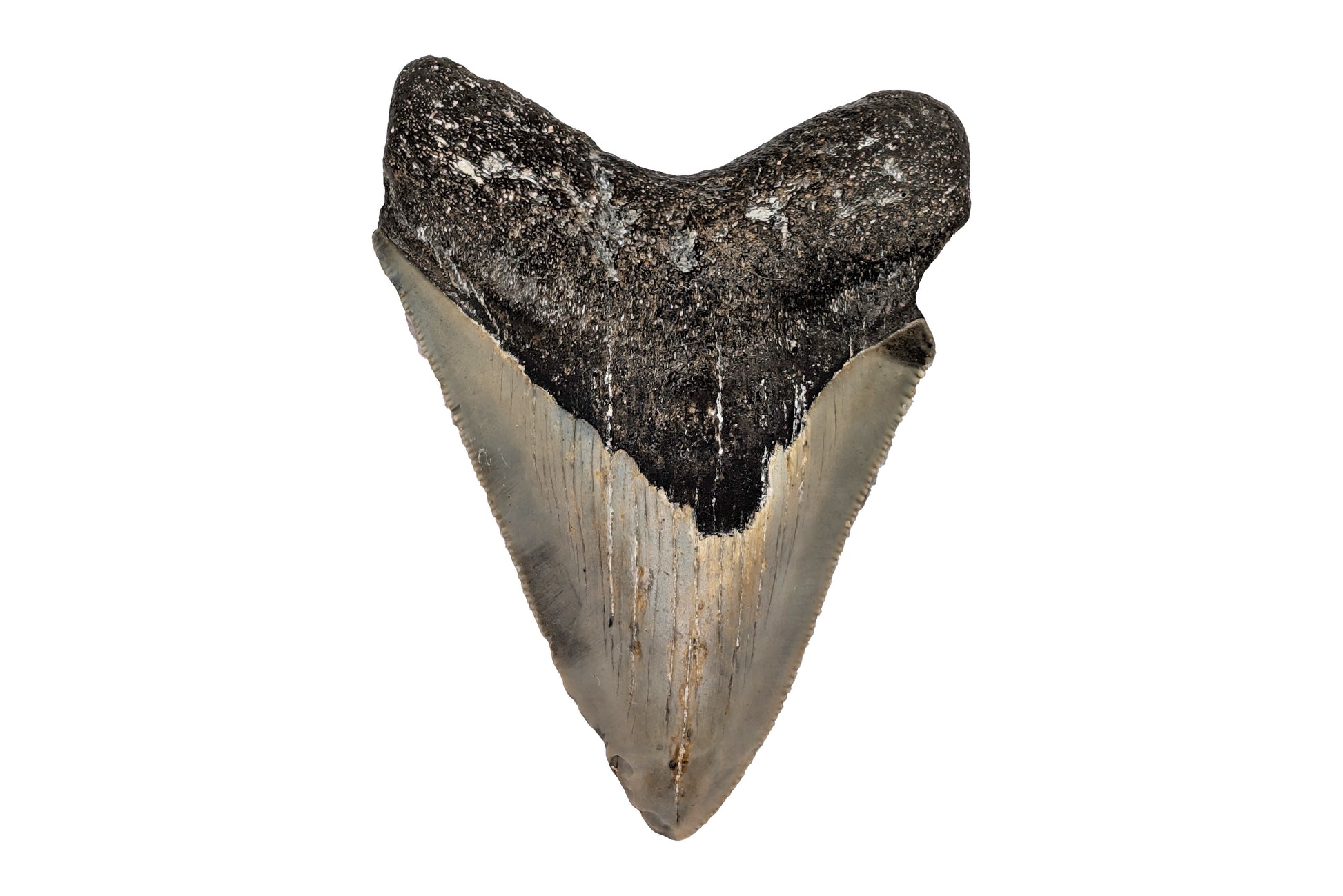 This is a serrated fossil megalodon tooth, measuring 3.56 inches in length, discovered off the coast of North Carolina. It likely belonged to a prehistoric mega-shark, approximately in the 20 foot size range.