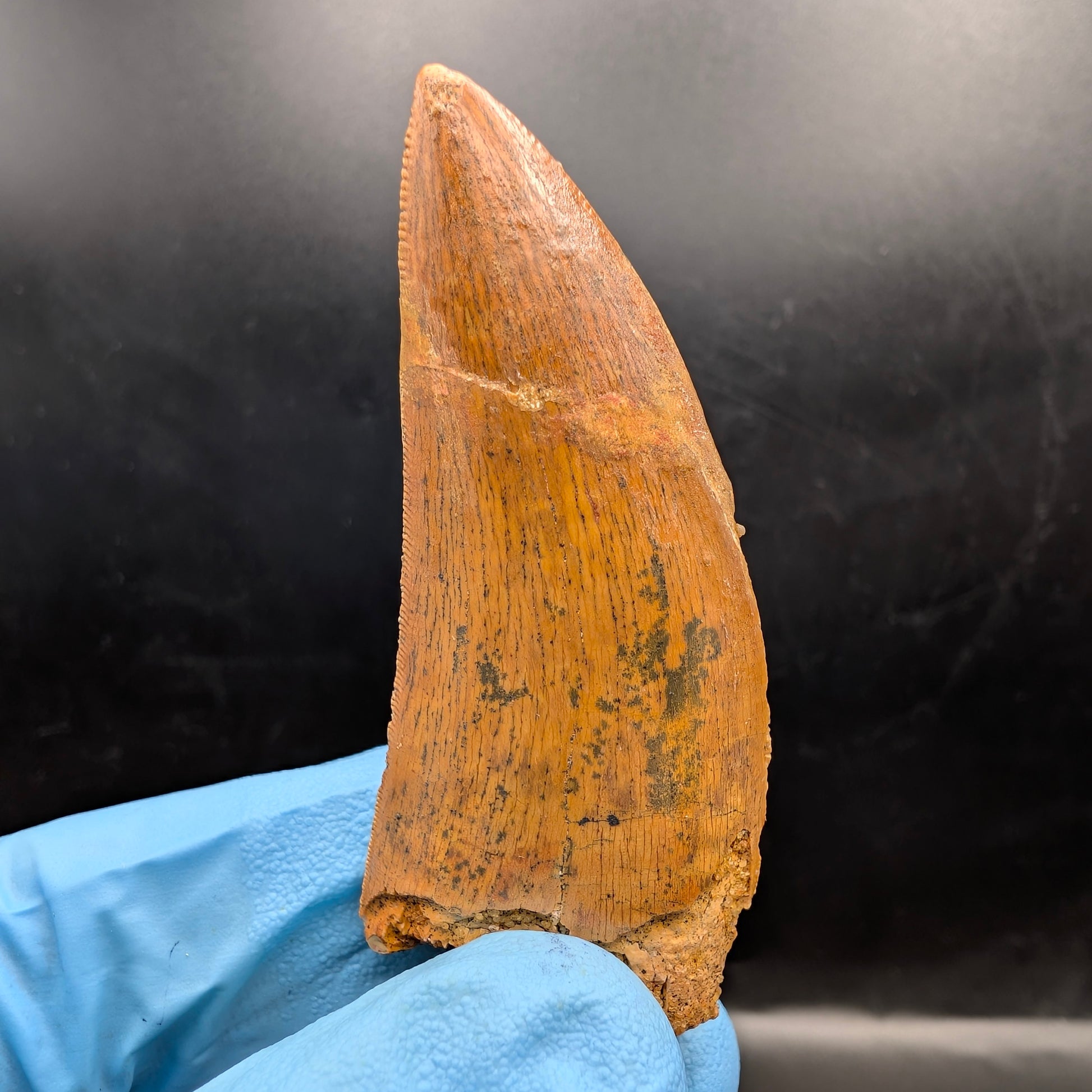 This is a real, 2.25" long Carcharodontosaurus dinosaur tooth from the famous Kem Kem Beds of Morocco. The tooth's enamel and serrations are in great condition!